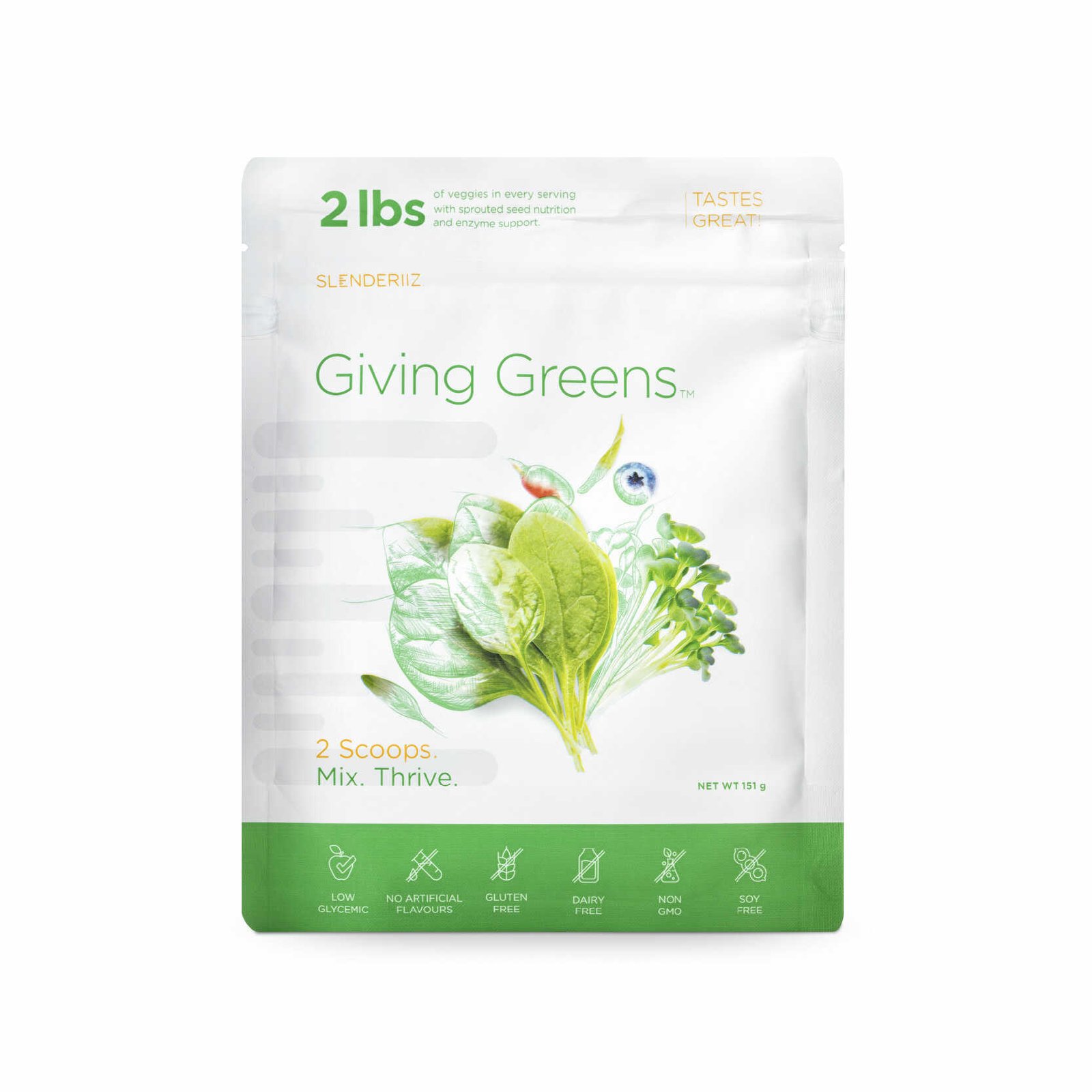 Giving Greens incluye una rica selección de ingredientes naturales que potencian la salud: hojas de espinaca, alfalfa, chlorella, brócoli, zanahoria, tomate, betabel, pepino, colecitas de Bruselas, col, apio, kale, espárrago, pimiento verde, coliflor, perejil, semillas germinadas como amaranto y mijo, superfrutas como bayas de goji, arándano y cereza acerola, y una mezcla de enzimas digestivas que incluyen amilasa, proteasa, lipasa, celulasa, glucoamilasa y papaína.